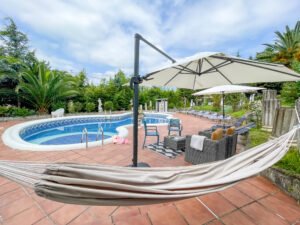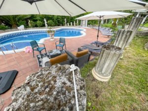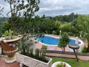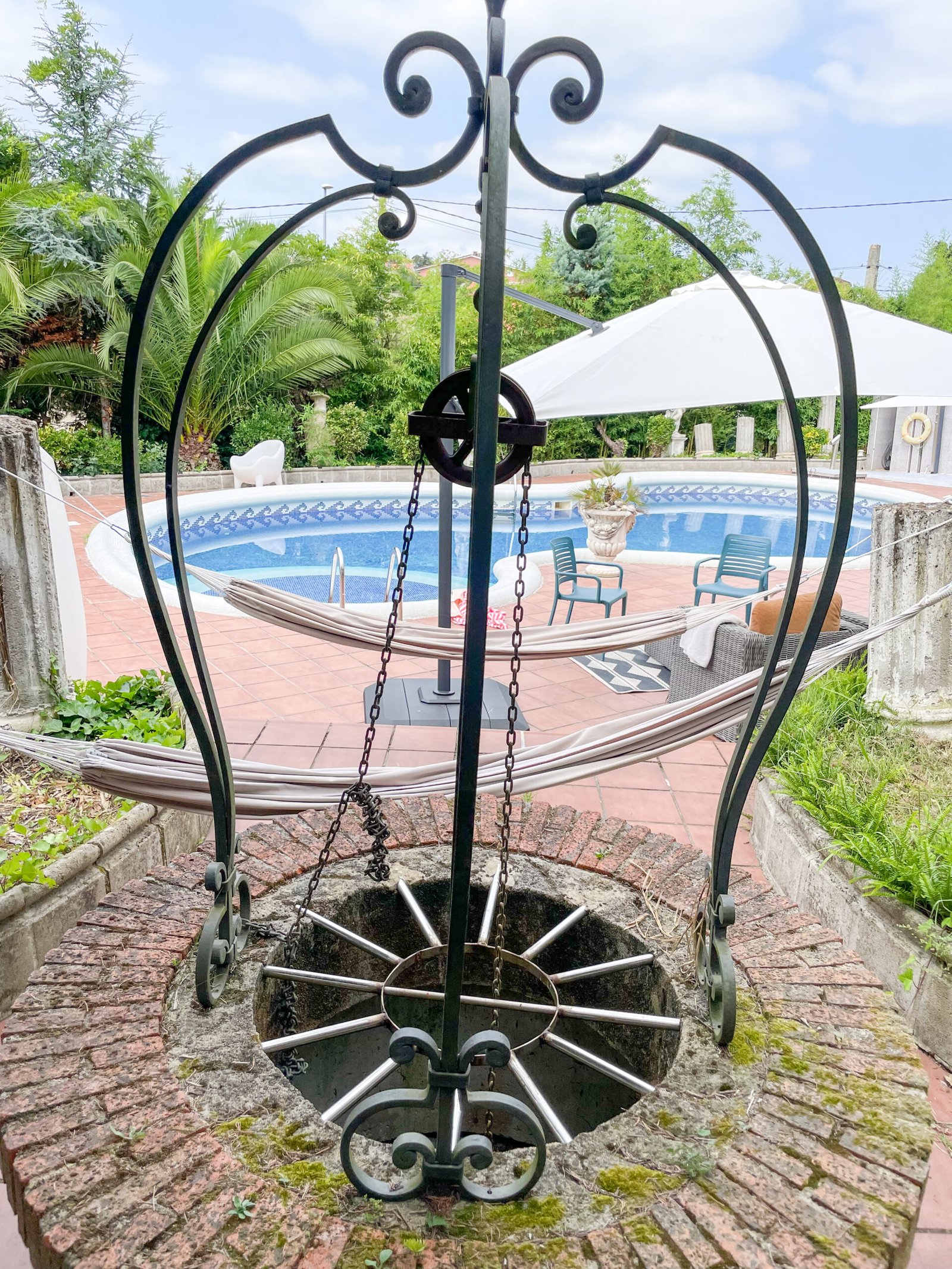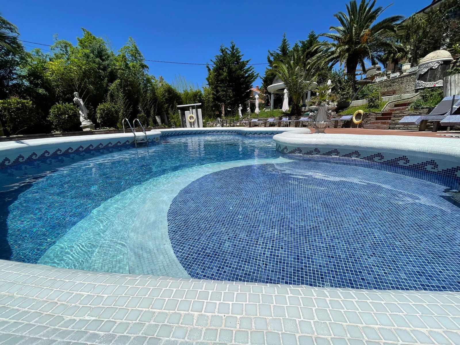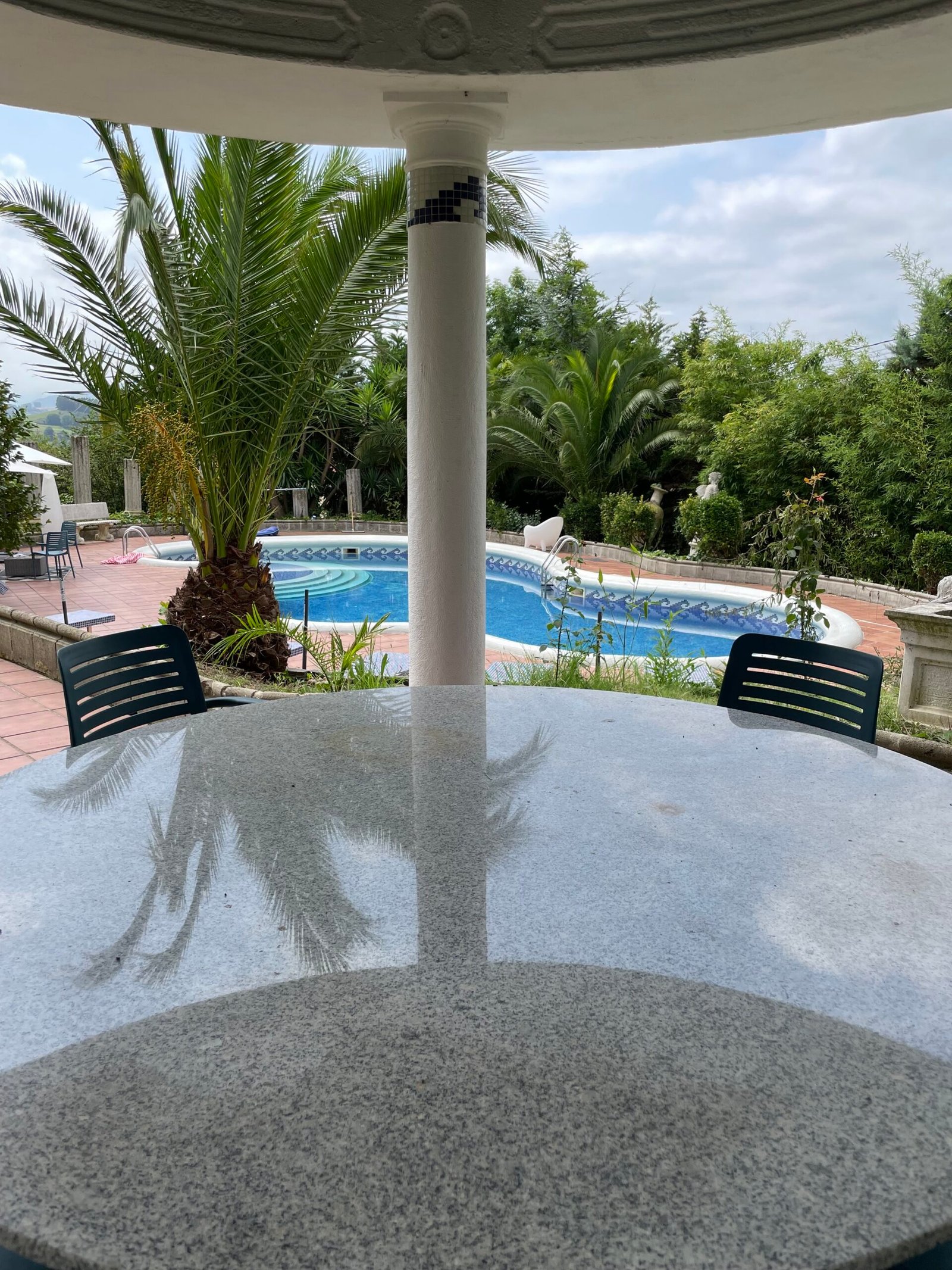 Contamos con una excepcional piscina de gresite y formas redondeadas con una superficie aproximada de 84 m2 (mayor que la de muchos hoteles de gran tamaño en Cantabria). Consta de dos partes, una circular, de entrada, con una profundidad de unos 30 cm pensada para estar tranquilamente sentado, tomándote algo charlando con tus amigos y refrescando el cuerpo en los días de calor. La otra parte, a la que se accede por unas cómodas escaleras, cuenta con una profundidad aproximada de 1,50 metros y una longitud máxima de 15, con lo que puedes practicar natación si no deseas perder la forma en verano. La temperatura en julio y agosto ronda los 27º centígrados.