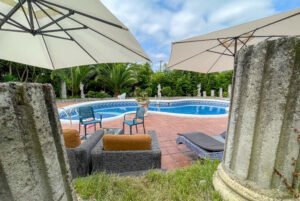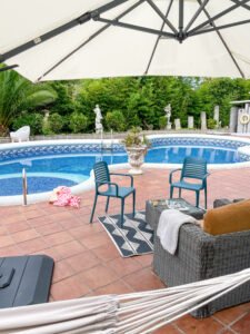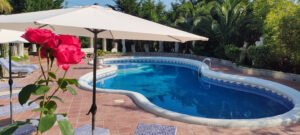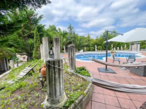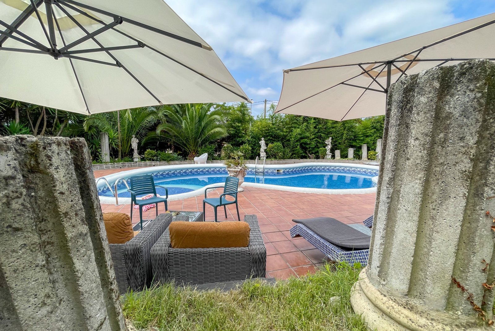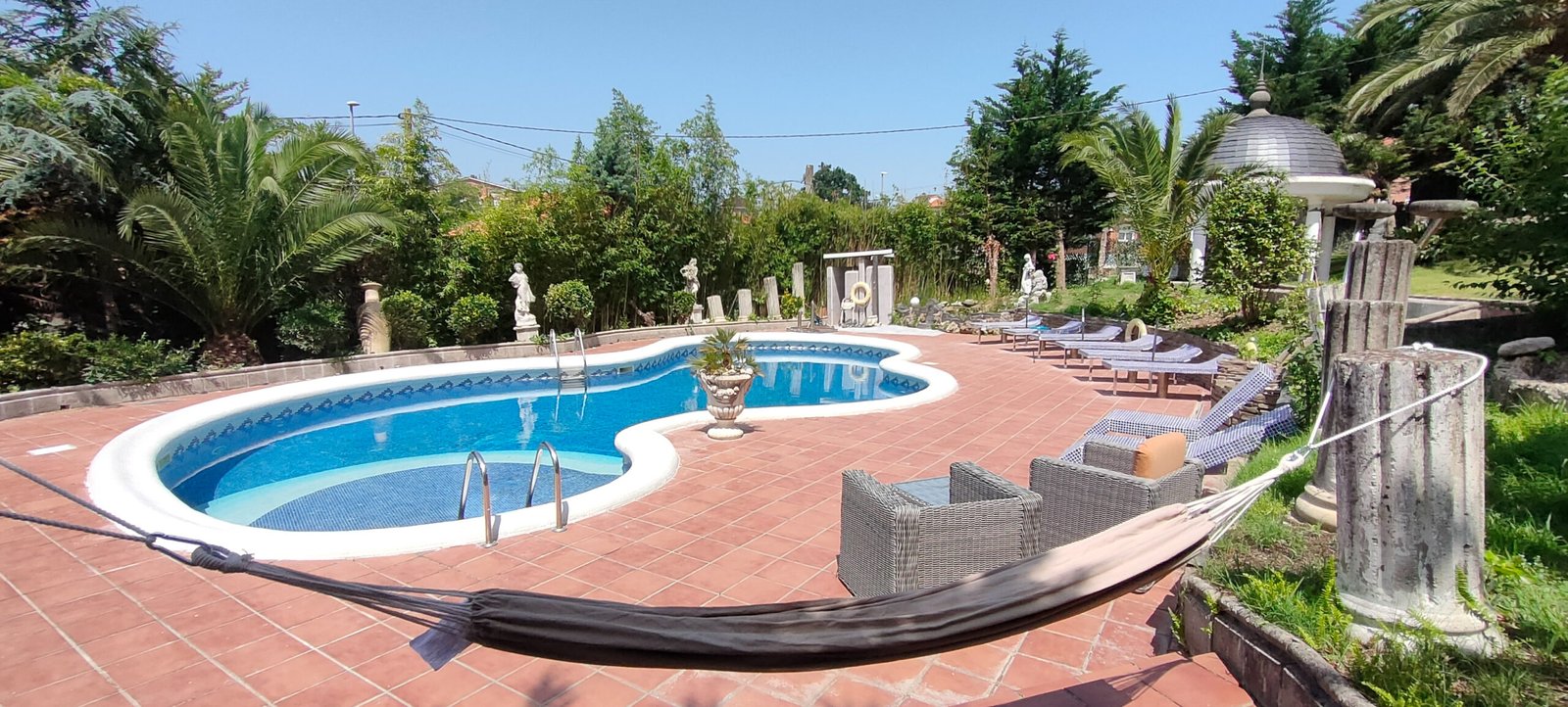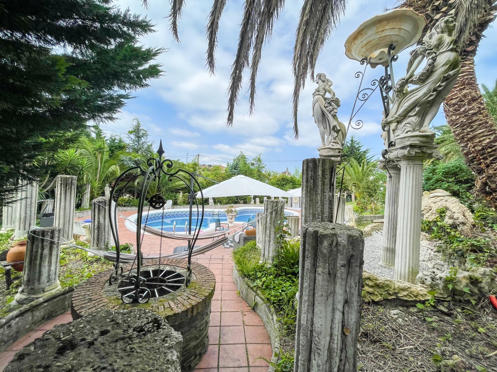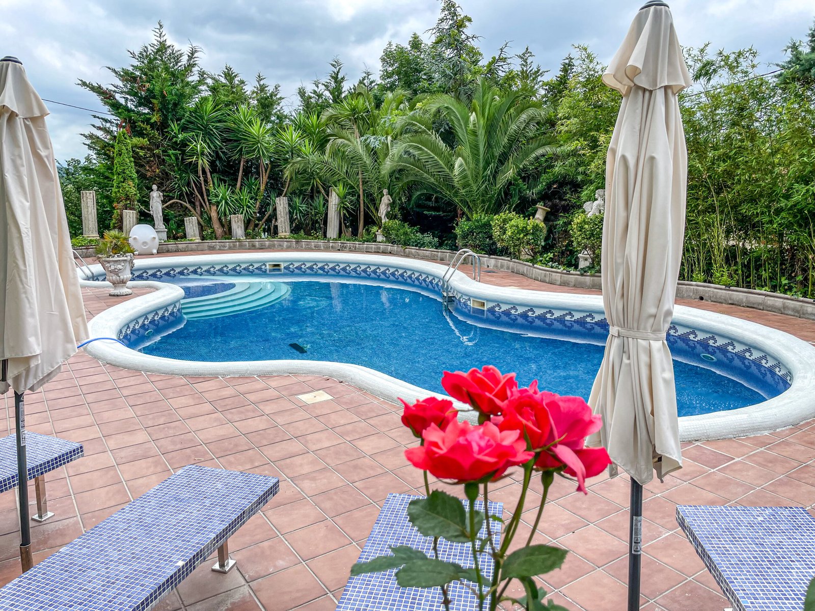 Contamos con una excepcional piscina de gresite y formas redondeadas con una superficie aproximada de 84 m2 (mayor que la de muchos hoteles de gran tamaño en Cantabria). Consta de dos partes, una circular, de entrada, con una profundidad de unos 30 cm pensada para estar tranquilamente sentado, tomándote algo charlando con tus amigos y refrescando el cuerpo en los días de calor. La otra parte, a la que se accede por unas cómodas escaleras, cuenta con una profundidad aproximada de 1,50 metros y una longitud máxima de 15, con lo que puedes practicar natación si no deseas perder la forma en verano. La temperatura en julio y agosto ronda los 27º centígrados.