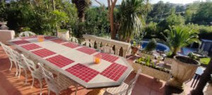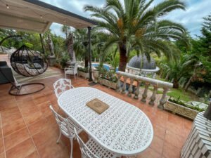 La segunda y principal terraza cuenta con diferentes mesas con capacidad total para más de 20 personas, y ofrece una espectacular panorámica sobre el jardín y la piscina.