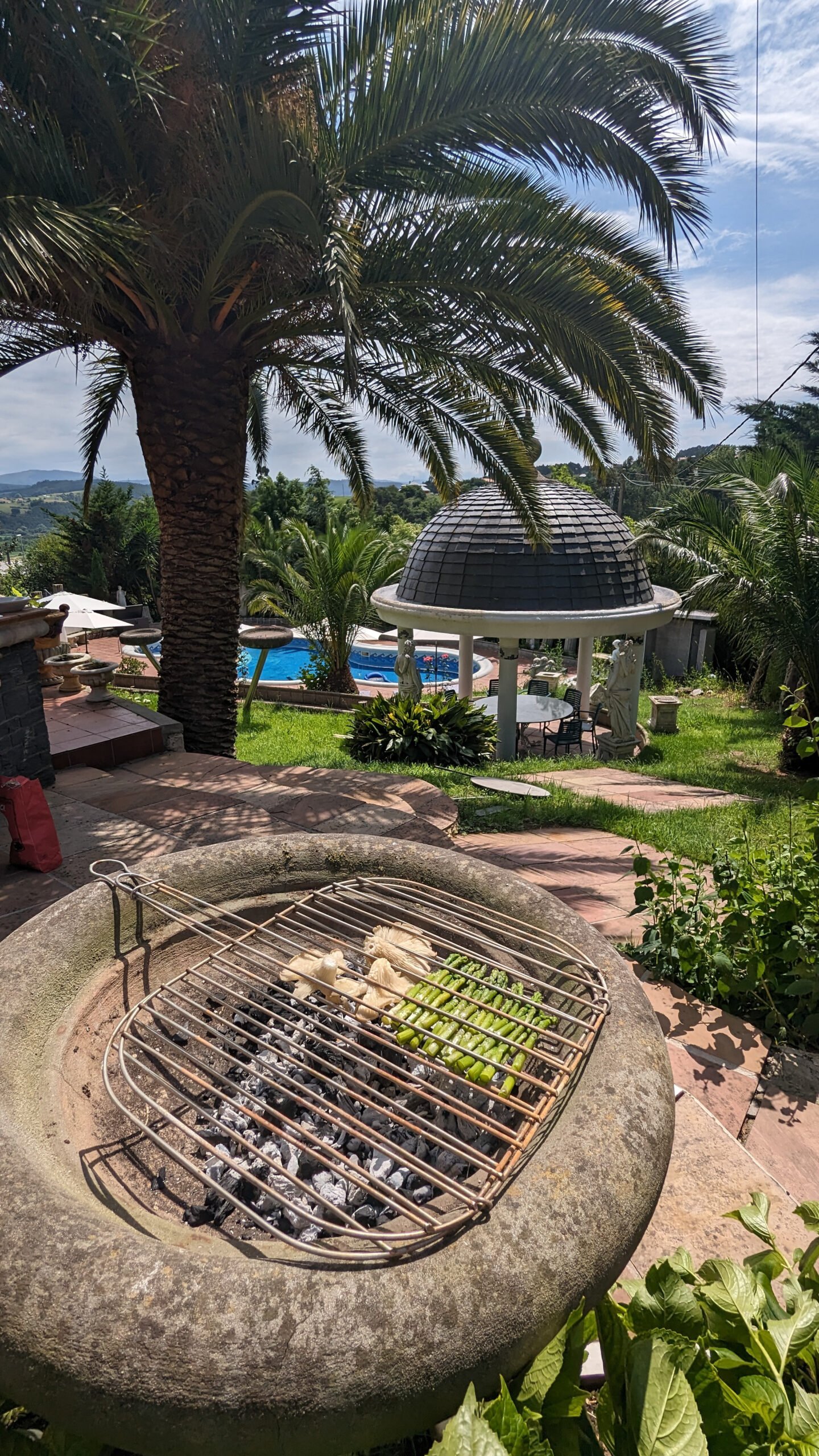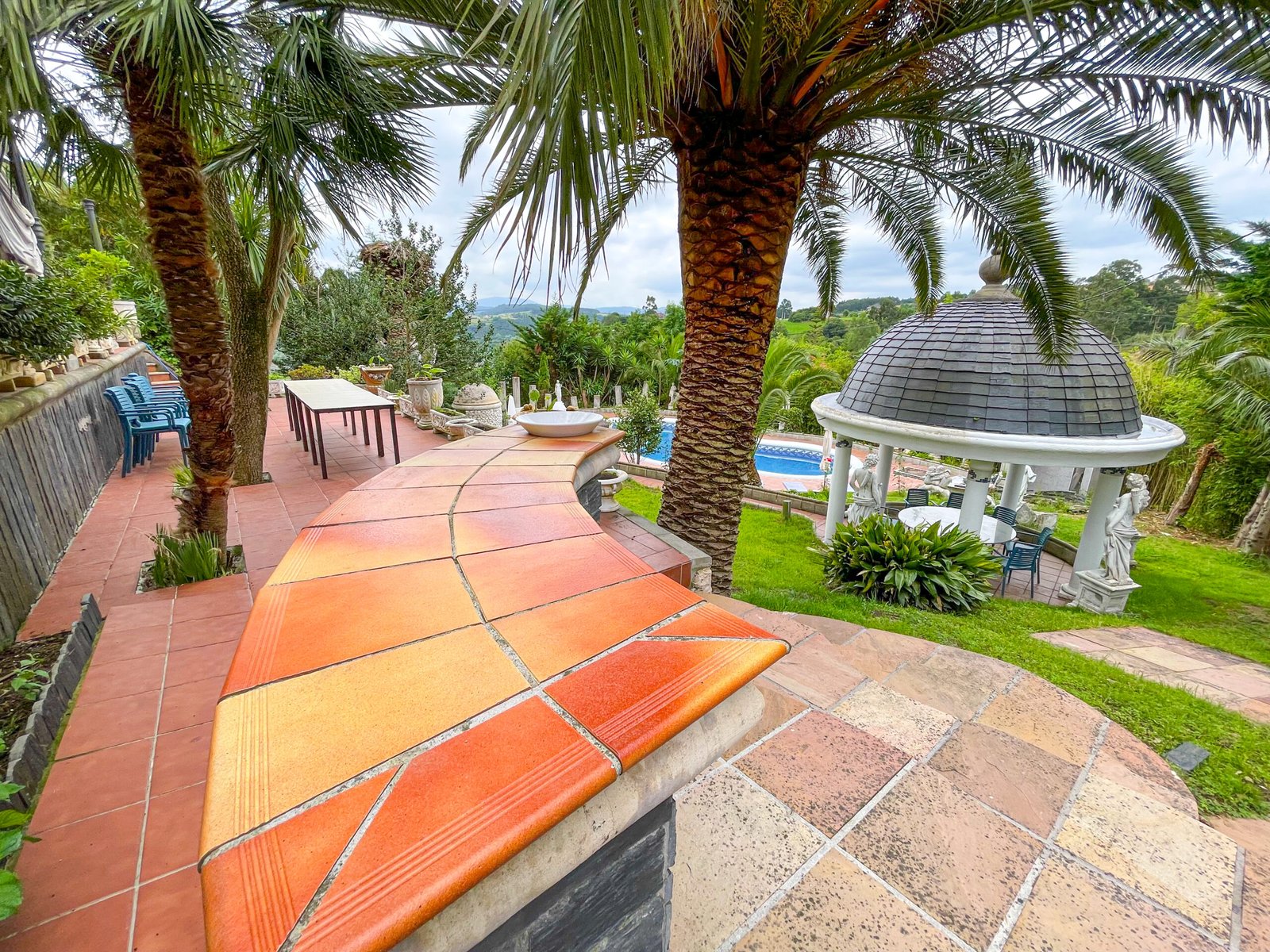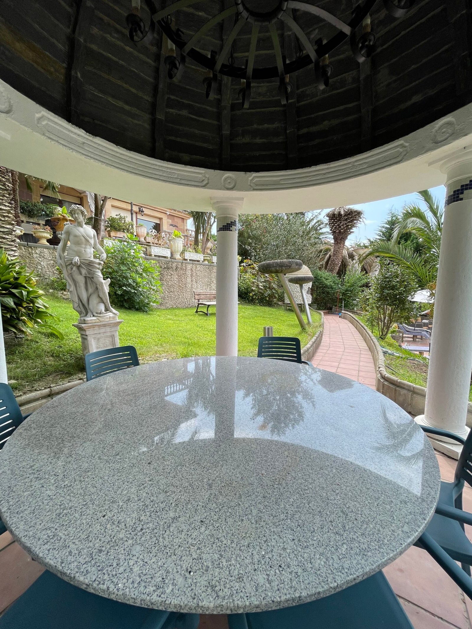 En la cuarta y última terraza, un pasillo nos lleva a un espectacular cenador, cerrado con taco gallego y pizarra. Una amplia zona ajardinada nos permite ofrecer un espacio para la colocación de invitados, zona de solarium, copeo,…
